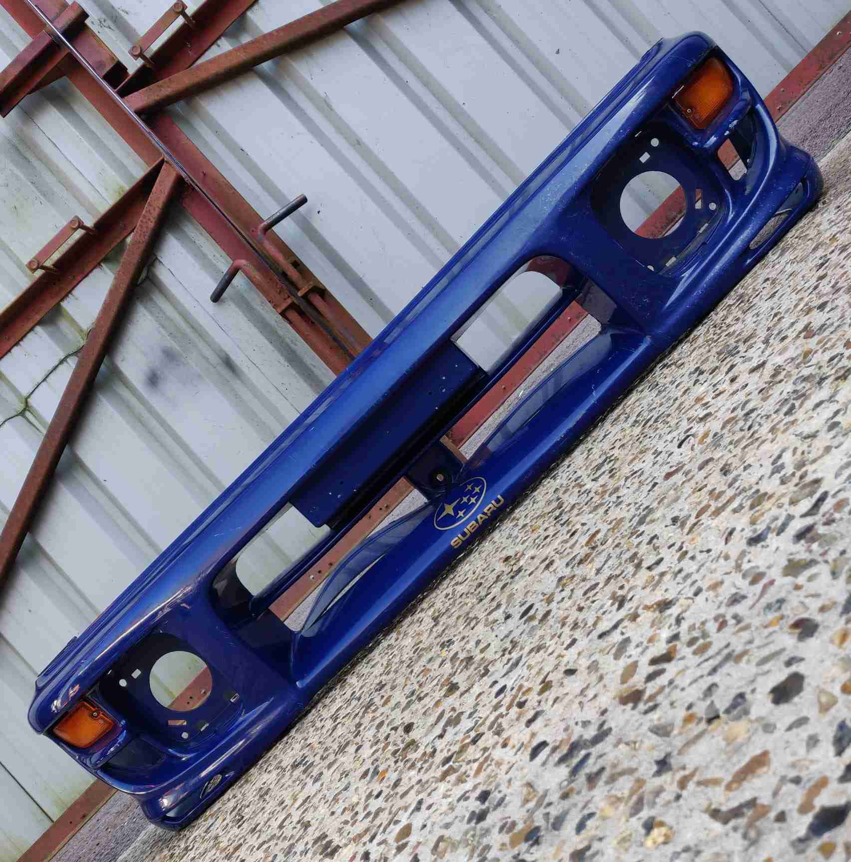 Impreza Version 7 Bugeye, front oem bumper, centre grille has been modified to accomdate front mount intercooler, please refer to photos, one tab is split. Bumper will need a respray due to storage marks and minor paint bubble.